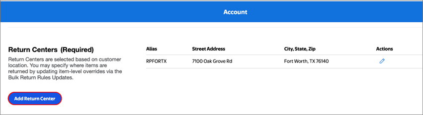 4. Select Add Return Center under the Return Centers (Required) heading.