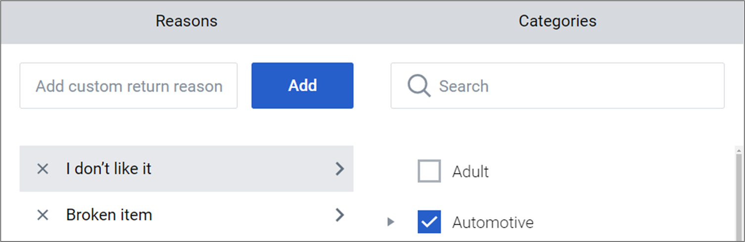 - 要添加原因,请在“添加自定义退货原因”框中输入原因,然后点击“添加”。