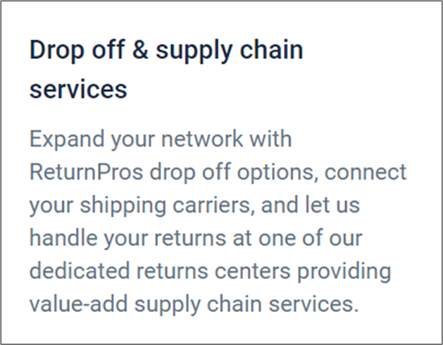 “投递与供应链服务”选项卡帮助您通过集成 ReturnPro 的投递选项和连接您的运输承运商,扩展退货管理能力。此功能可通过在专用退货中心处理退货来优化退货流程,并提供增强的供应链服务,为您的业务运营增值。