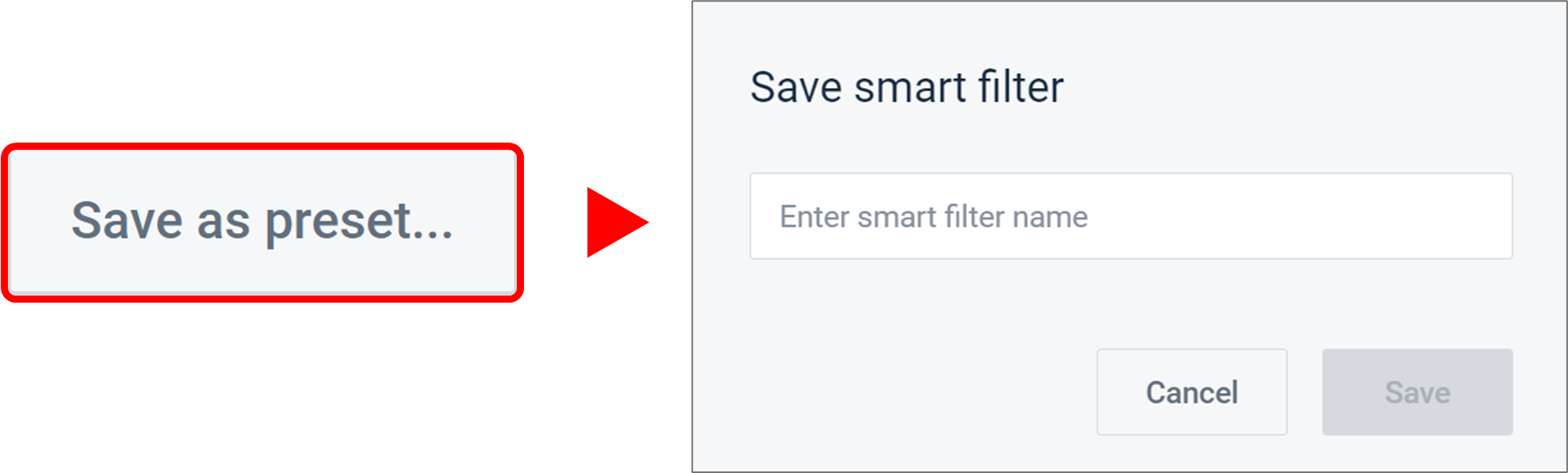 - 保存为预设 允许您将当前筛选器列表保存为“智能筛选器预设”。您可以为预设命名,并且以后可以通过点击“选择智能筛选器预设”下拉菜单,从筛选器抽屉中选择它。