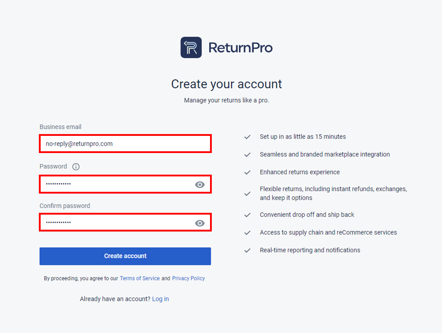 5. 检查您的收件箱,查找来自 no-reply@returnpro.com 的验证邮件。